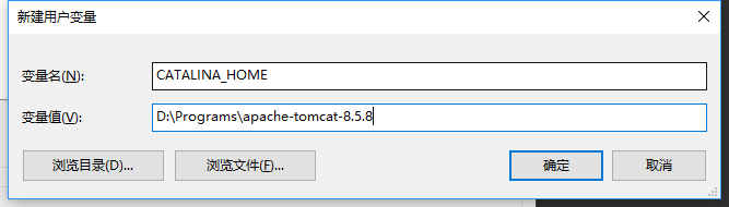 下载 Tomcat,解压到一个目录,如 D:\Programs\apache-tomcat-8.5.8,并将此目录添加为 CATALINA_HOME 环境变量。