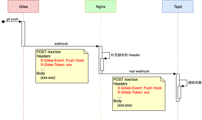 方案的原理简单来说就是 Gitee 在触发 webhook 时,向目标网址发起的请求和 GitLab 很雷同,只是有个别 Header 的名字不一样,但缺失特定的 Header 信息后无法正常触发 Tapd 的源码关联,所以可以通过 Nginx 反向代理来将缺失的 Header 补全,然后将请求转发给 Tapd 即可。