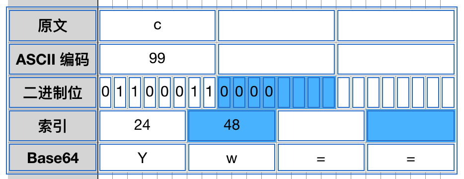 Base64 是一种基于 64 个可打印字符来表示二进制数据的表示方法。由于 2^6=64,所以每 6 个比特为一个单元,对应某个可打印字符。3 个字节有 24 个比特,对应于 4 个 Base64 单元,即 3 个字节可由 4 个可打印字符来表示。