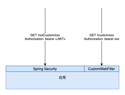 一个应用对外提供 Rest 接口,接口的访问认证通过 Spring Security OAuth2 控制,token 形式为 JWT。因为一些原因,某一特定路径前缀(假设为 /custom/)的接口需要使用另外一种自定义的认证方式,token 是一串无规则的随机字符串。两种认证方式的 token 都是在 Headers 里传递,形式都是 Authorization: bearer xxx。